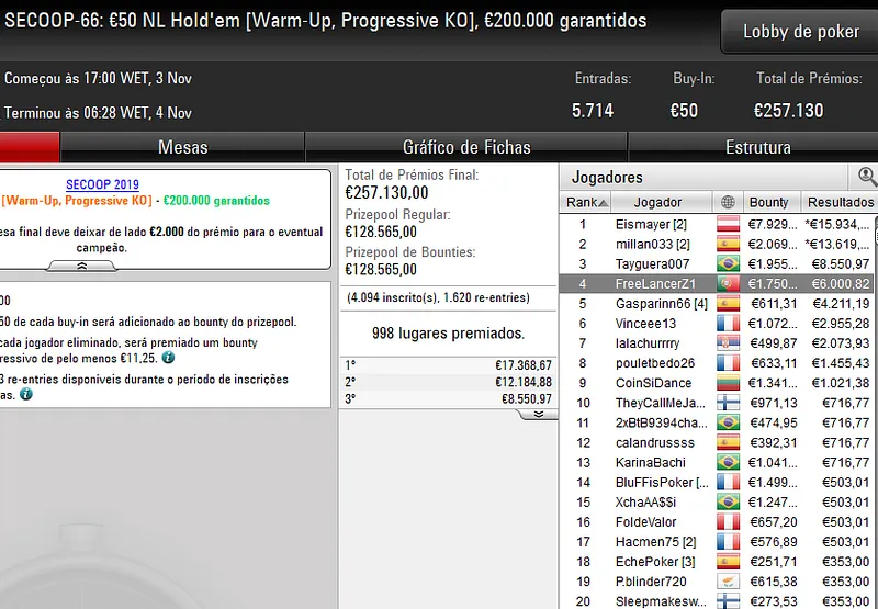 TELMO10NN foi outro dos tugas em destaque na sessão de ontem. O jogador português garantiu um lugar entre os três finalistas que fizeram um acordo no SECOOP-75: €100 Sunday Supersonic e teve direito a um prémio de €8.280, despedindo-se do torneio no segundo lugar.