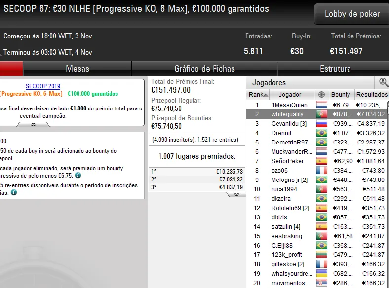 Quem ficou muito perto de um título foi o dono da conta dmartim. O luso foi segundo classificado entre as 2.044 entradas registadas no SECOOP-73: €50 NLHE [BigStack Turbo] e além da medalha de prata levou para casa um prémio de €9.166.
