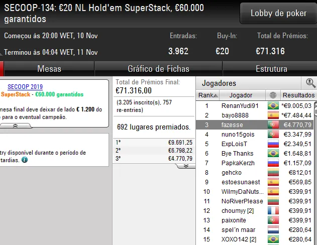 Já o maior prémio nacional na sessão SECOOP de ontem, veio pelas mãos de BarbosaFLE. O jogador português ficou a um passo do pódio no SECOOP-130: €50 NLH [Warm-Up], evento que contou com 5.225 entradas, e recebeu €10.979 pelo quarto lugar.