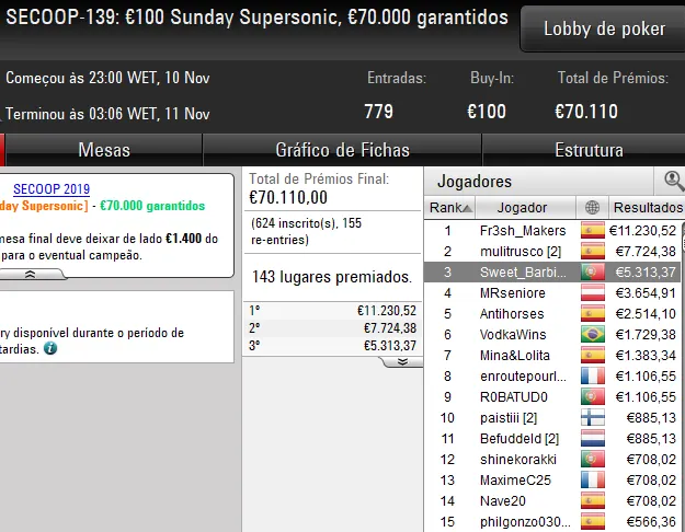 A vitória foi conquistada por Tlitado no SECOOP-138: €20 Midnight Express [8-Max, Hyper], evento que registou 3.049 entradas e um prize pool de quase €55.000.