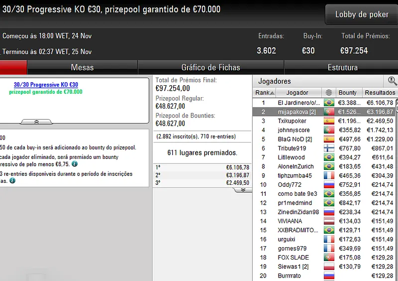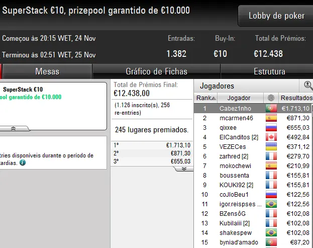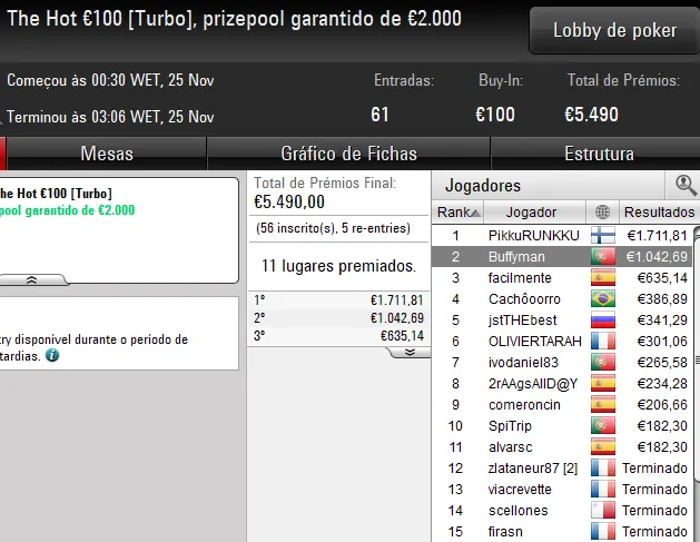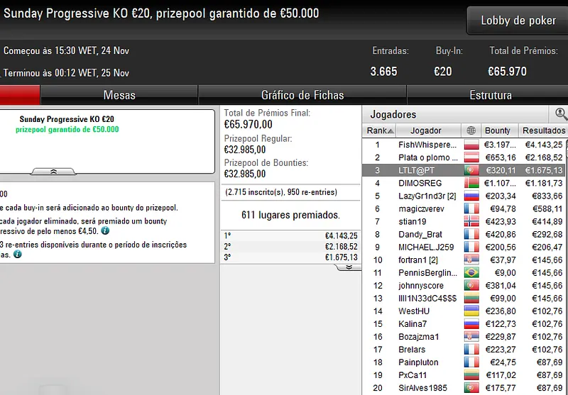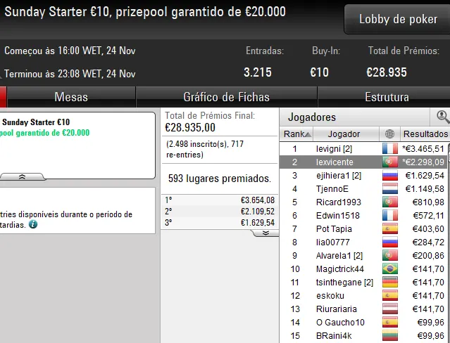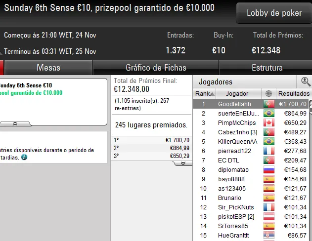 Já o dono da conta 2_KD, garantiu a vitória no 30/30 Sunday Supersonic [6-Max, Hyper]. O luso foi o melhor entre um field de 1.078 entradas e recebeu €4.259 após bater o campatriota m@L_AAmen no heads-up, jogador que recebeu €2.134 pelo segundo lugar.