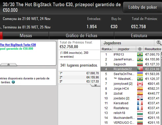 Outro dos destaques deste domingo foi Ricardo "Rcaridade22" Caridade. O luso encaixou um prémio de €2.224 ao terminar no 4º lugar do 30/30 The Hot BigStack Turbo e somou mais €2.487 à sua banca com um segundo lugar no Midnight Express €20.