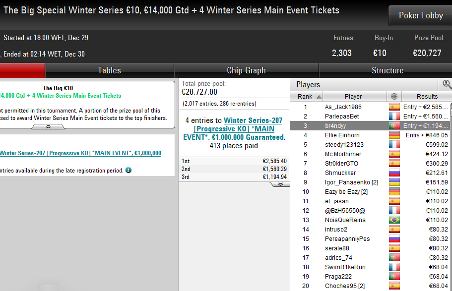 Bruno "MysticLie6" Cardoso subiu ao pódio do Winter Series-46: €50 NLHE Winter Afternoon on Stars [8-Max] e garantiu o maior prémio luso do dia. Os 923 jogadores inscritos neste evento fizeram 301 reentradas para criar um prize pool de €55.080.