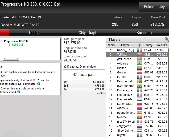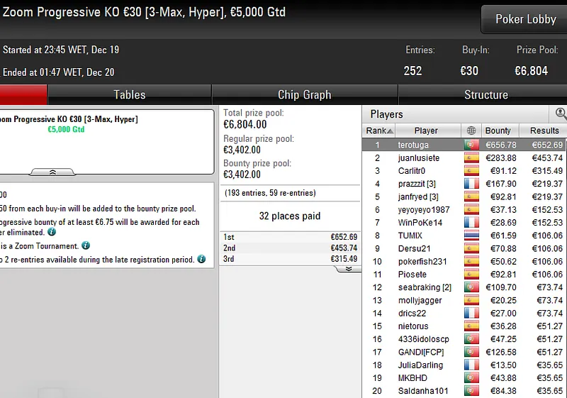 Quem também faturou na sessão de ontem foi Ricardo "mat3us" Mateus. O luso ficou a um passo da vitória no Progressive KO €50 [6-Max], torneio que registou 679 entradas e mais de €30K em prémios, e engordou a banca com €2.695 ao terminar no segundo lugar.