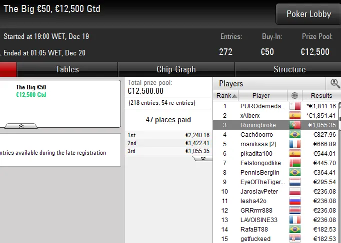 Já o grinder kryingkid, foi o melhor entre um field de 58 entradas no The Hot €100 [Turbo]. O português despachou toda a concorrência em pouco mais de duas horas e meia de jogo e foi recompensado com um prémio de €1.628.