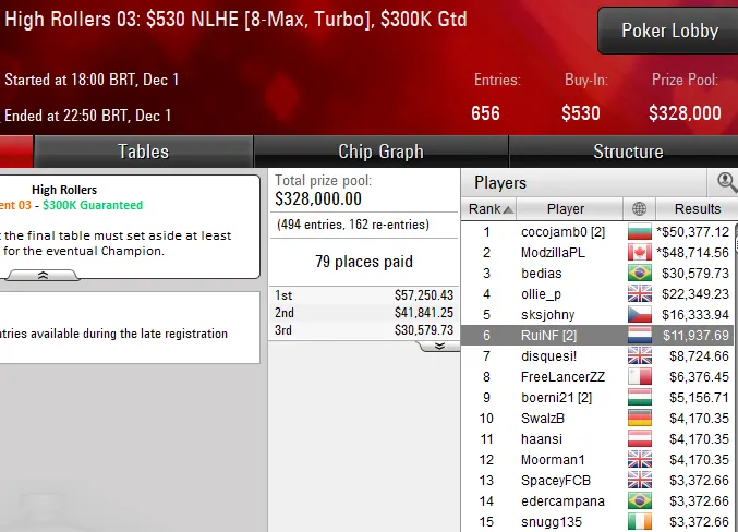 Na outra mesa final com representação lusa tivemos Rui "RuiNF" Ferreira e Michel "FreeLancerZZ" Dattani entre os oito finalistas do High Rollers 03: $530 NLHE [8-Max, Turbo], torneio que contou com um field de 656 entradas para distribuir $328K em prémios.