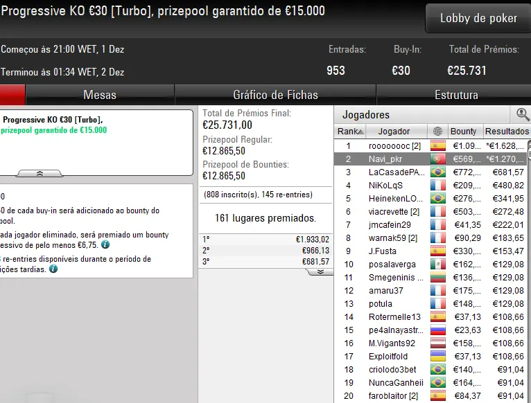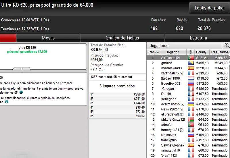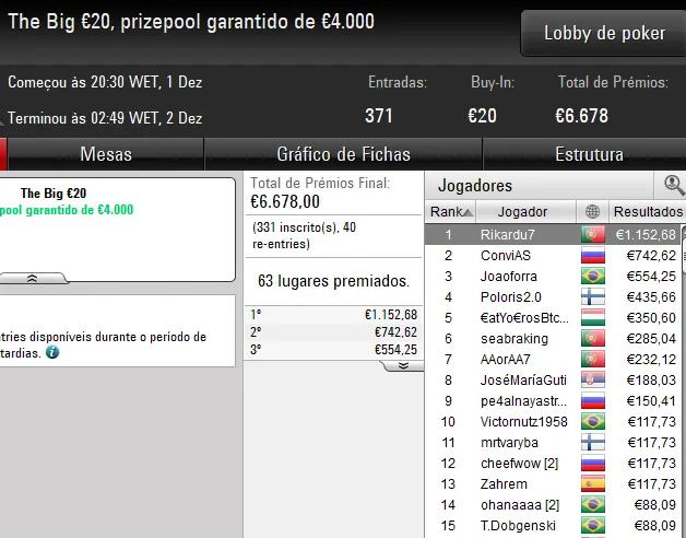 Destaque também para a vitória de rapinzi1988 no Uppercut €20. O português superou 1.950 jogadores, num field total de 2.550 entradas, para reclamar o título e um prémio total de €4.342.