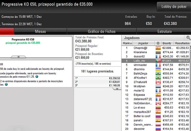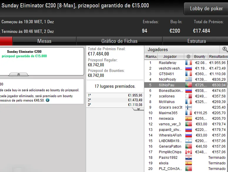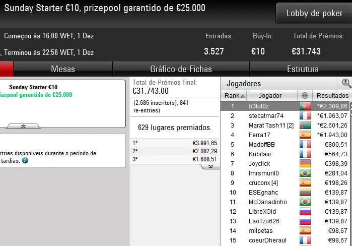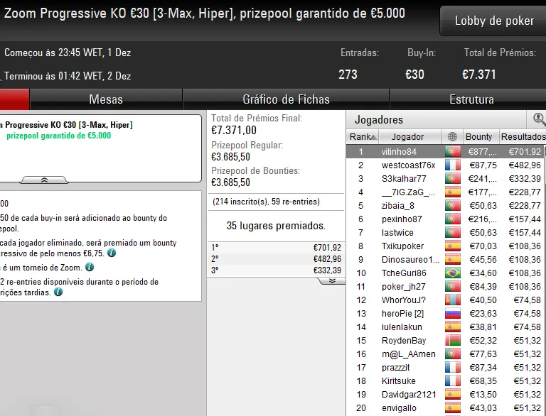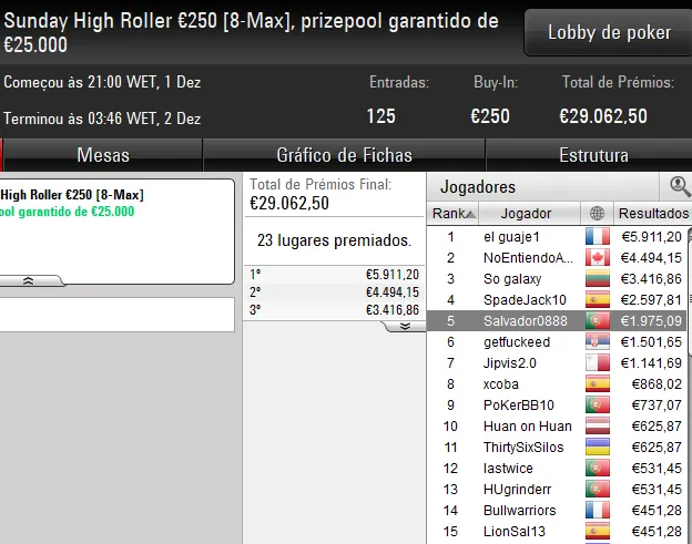 Na mesa final, o eventual vencedor teve a companhia de quatro compatriotas — tronfox foi o bolha do pódio para €3.500, Pnmr23sdt levou €2.125 pelo sexto lugar, estoucomxixi encaixou €1.125 na 8ª posição e Ricardo "10rmc10.pt" Caprichoso foi o primeiro a cair na FT para €705.