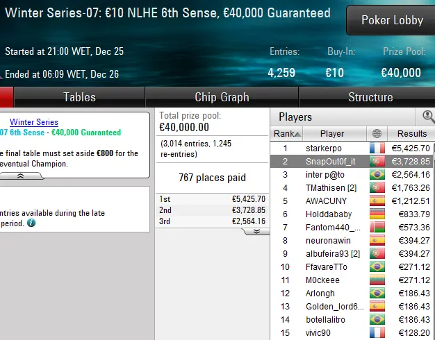 Um dos grandes destaques da sessão foi dixers110, jogador que encaixou o maior prémio luso do dia. No Winter Series-03: €10 [Xmas The Classic], evento que contou com 12.680 entradas e €125K em prémios, o português só não bateu o embaixador e streamer da PokerStars Albeto Pérez e terminou no 2º lugar para um prémio de €10.912.