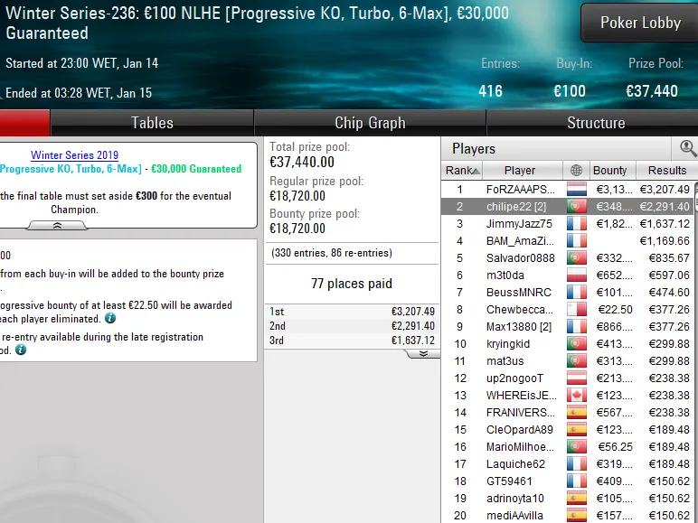 Quem também faturou ouro foi Arwen Undómiel, jogador que despachou um field de 753 entradas no Winter Series-227: €50 NLHE [Progressive KO, 6-Max] para receber €4.900. O seu adversário no heads-up foi Pedro "60NoPau" Neves, que levou €2.053 no segundo lugar.