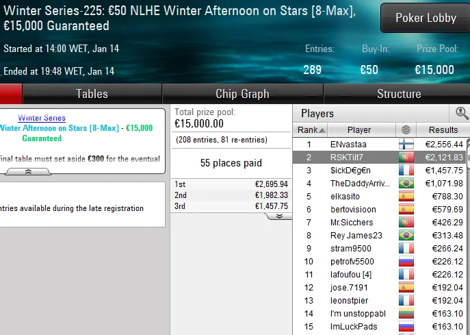 | 14:00 | Winter Series-237: €50 NLHE Winter Afternoon on Stars [8-Max] | €15.000 |