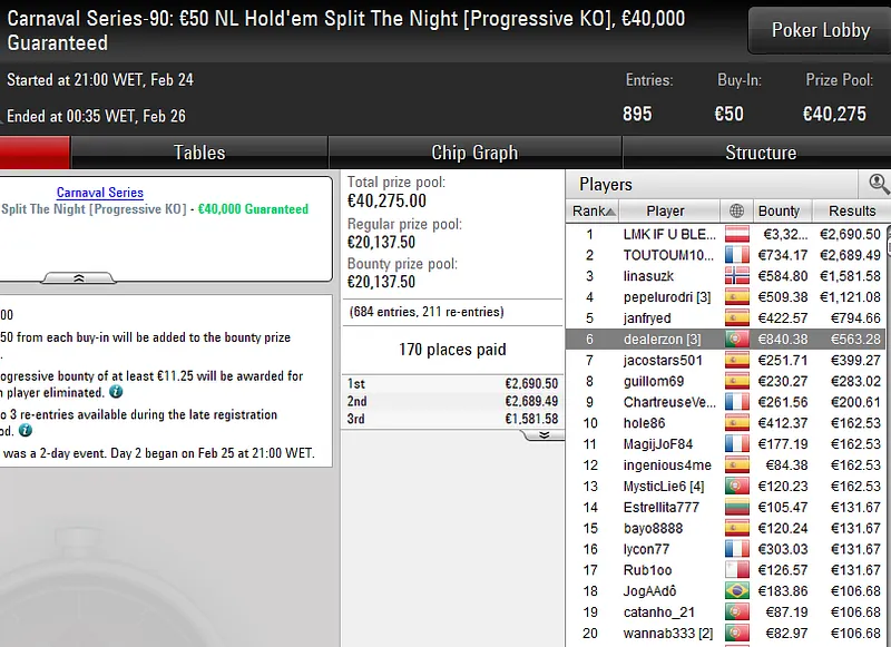 Antes da vitória acima, dealerzon já tinha disputado a mesa final do Carnaval Series-90: €50 NLHE Split The Night PKO, torneio onde caiu na sexta posição para €1.403.