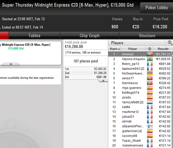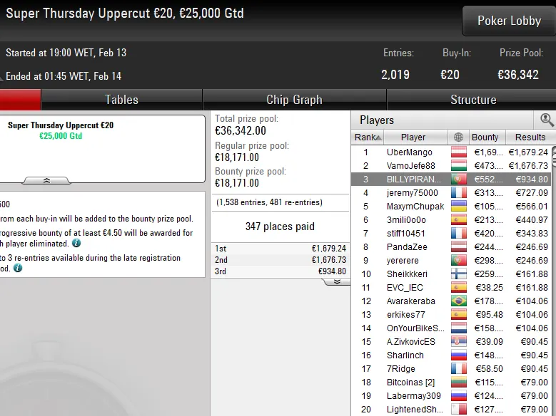 No SuperSeries #24 - €4.000 Deepstack Mini, o luso dono da conta Pinoquio7 despachou um field de 279 entradas para sagrar-se campeão deste evento com buy-in de €22. A vitória rendeu um prémio de €1.080.