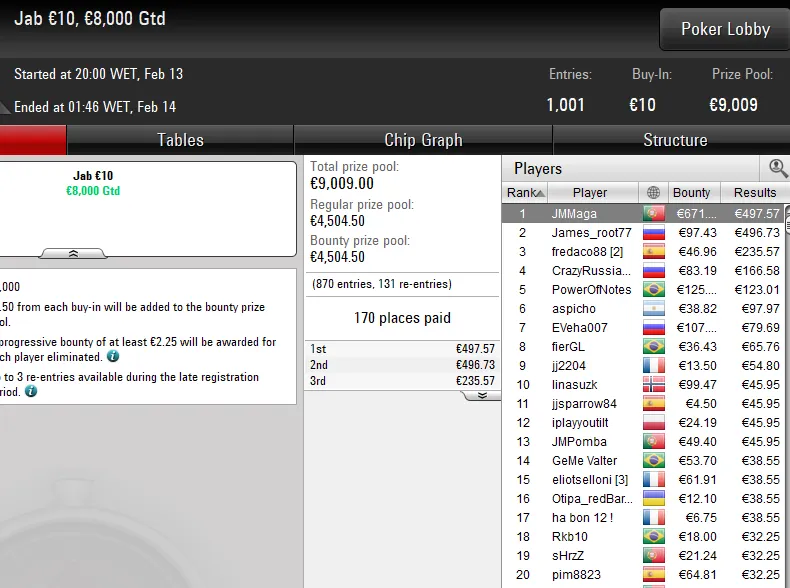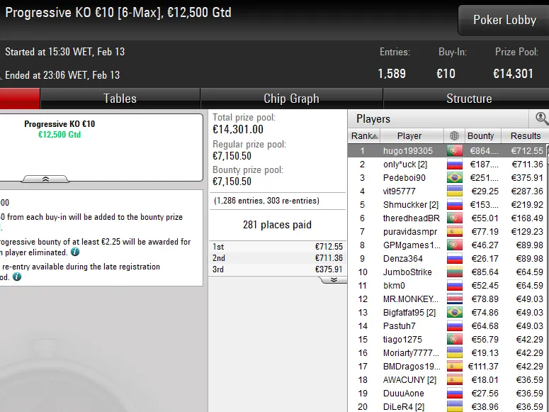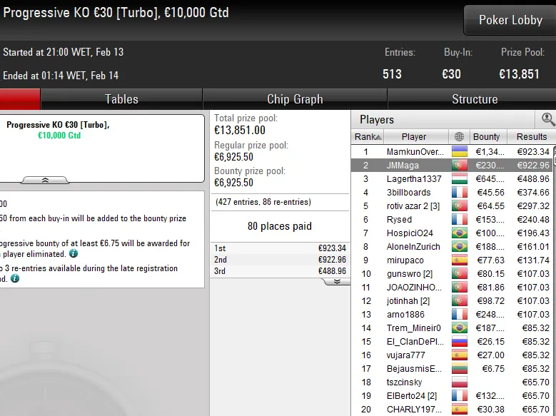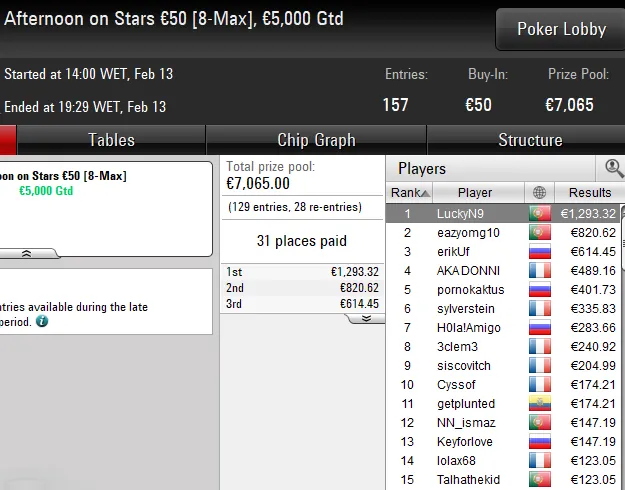 Quem também não se pode queixar da sessão de ontem é TheGandalf28. O português bateu toda a concorrência no The Big €50, torneio que registou 239 entradas, e levou para casa um prémio de €1.927. No terceiro lugar do pódio ficou Bruno "MysticLie6" Cardoso, com direito a €907.