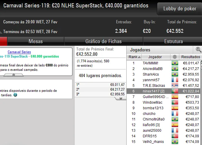 BILLYPIRANHA ficou a um passo do título e foi recompensado com €3.961, enquanto Nuno "garradominador" Rocha faturou €2.780 na terceira posição e derleizao77 levou para casa €1.369 graças a um honroso quinto lugar.