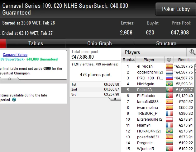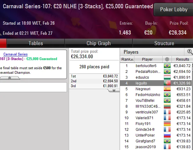 Além da vitória, Rodrigo Carmo também reservou lugar na mesa final do Carnaval Series-109: €20 NLHE SuperStack, evento onde terminou na sexta posição entre 2.656 entradas para encaixar mais €1.129.