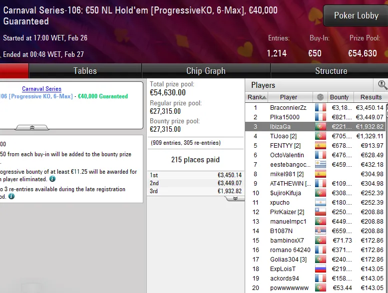| 23:00 | Carnaval Series-123: €20 Midnight Express [8-Max, Hyper] | €25.000 |