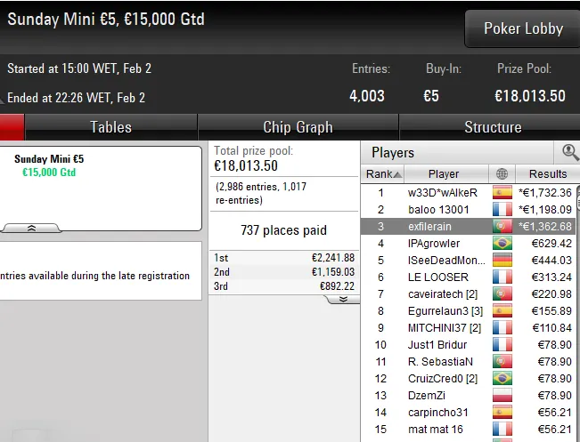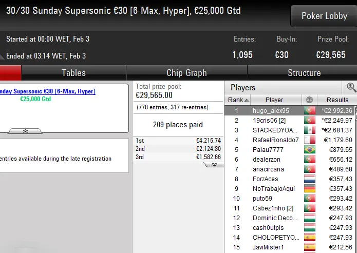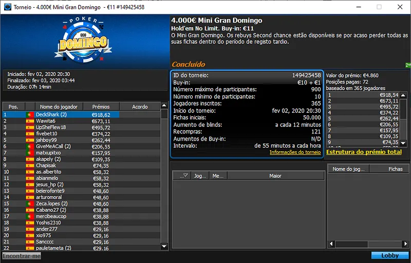 O dono da conta Semilhaaaaaa foi o grande campeão e viu quase dez horas de grind recompensadas com um prémio de €7.556. Os restantes lusos na mesa final foram: PistolKingx (3º para €4.040), Diasnacruz (4º para €3.040), ZeFarturas (5º para €2.126), SpewyBoi (6º para €1.700) e xorra71 (9º para €600).