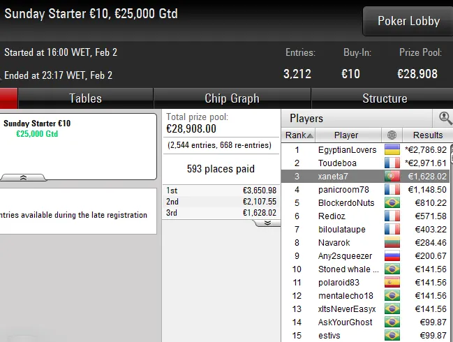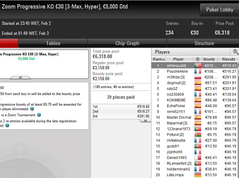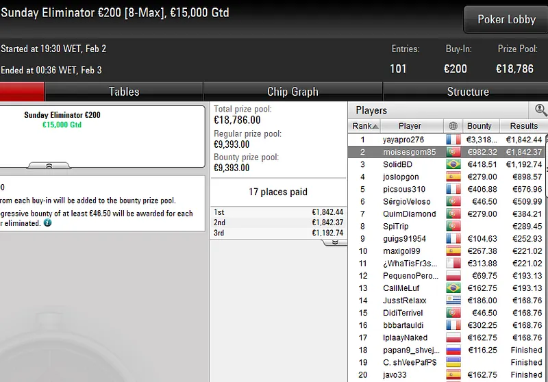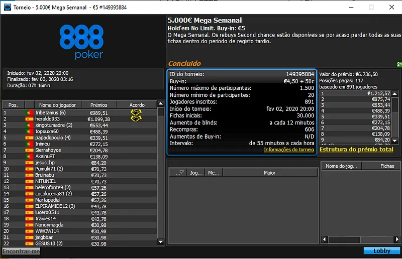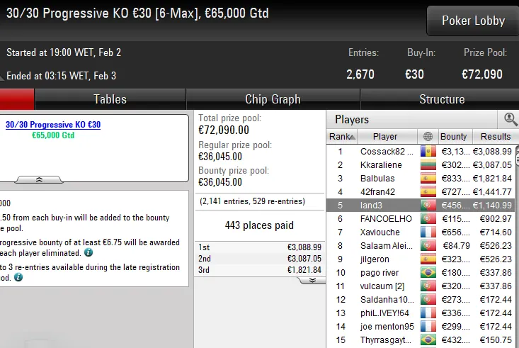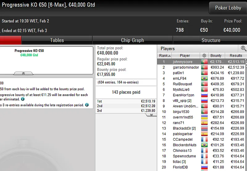 Este torneio viu 6.879 jogadores, que fizeram 3.342 reentradas, na luta por uma parte dos €100.000 em jogo e o grinder português garantiu a segunda maior fatia do bolo após acordo no heads-up. birillolisboa terminou no segundo lugar com direito a €6.944.
