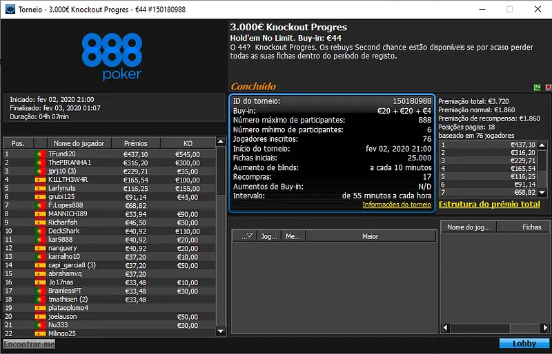 Já nas mesas da PokerStars.pt, os portugueses também somaram bons resultados, com grande destaque para o segundo lugar de birillolisboa no The Classic €10.