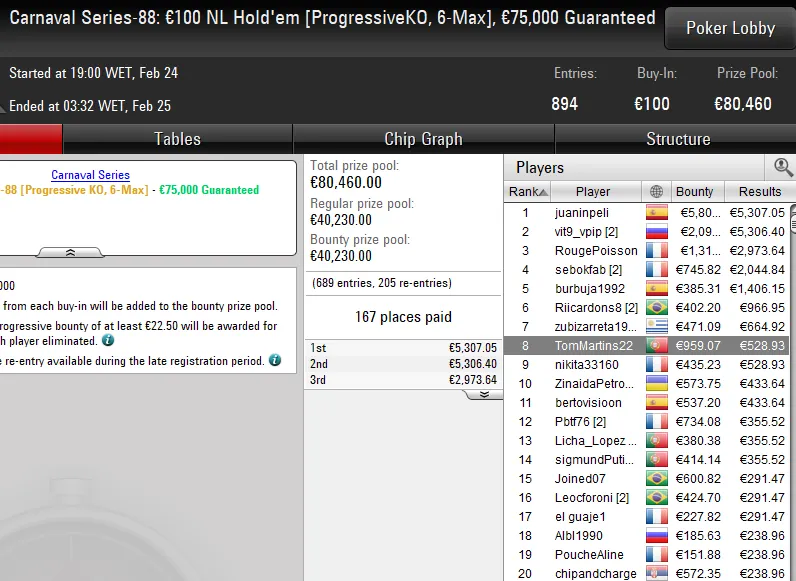 Quem também brilhou na sessão de ontem foi o dono da conta hugofmartins, responsável por um dos três títulos portugueses da sessão. O luso foi o melhor entre um field de 3.269 entradas no Carnaval Series-87: €20 NLHE PKO e faturou €5.789.
