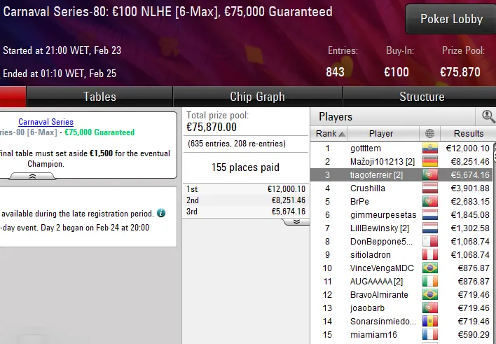 A completar o trio de campeões temos Zeza Zangada, grinder que garantiu €4.655 ao vencer o Carnaval Series-84: €30 NLHE [Deep], evento que contou com 1.067 entradas. No segundo lugar terminou o seu compatriota DoBulbo, jogador que levou para casa €3.278.