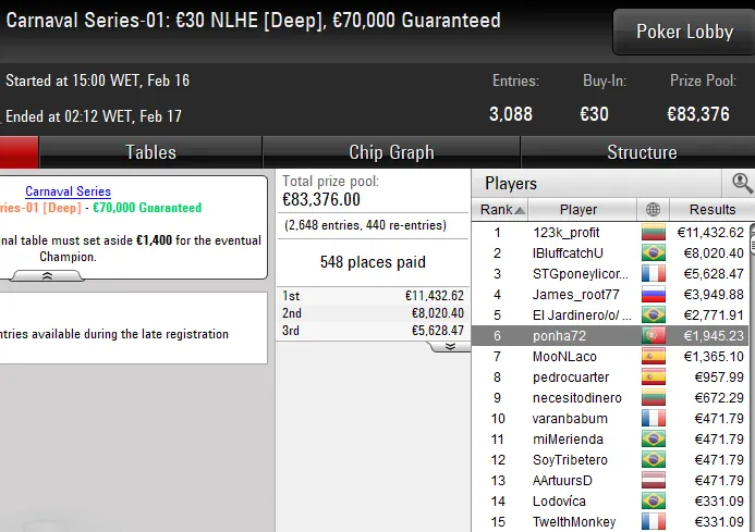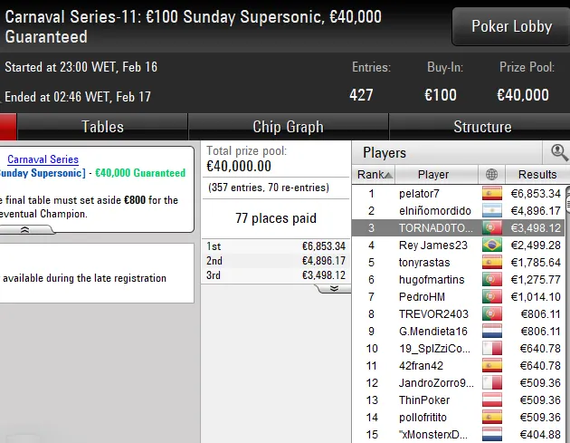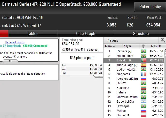 O Carnaval Series-03: €50 NLHE [Warm-Up] viu 4.047 entradas na corrida por uma parte dos €182.115 em jogo, e o português levou para casa uma boa parte do bolo ao terminar no segundo lugar — prémio de €17.224.