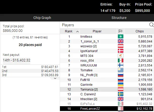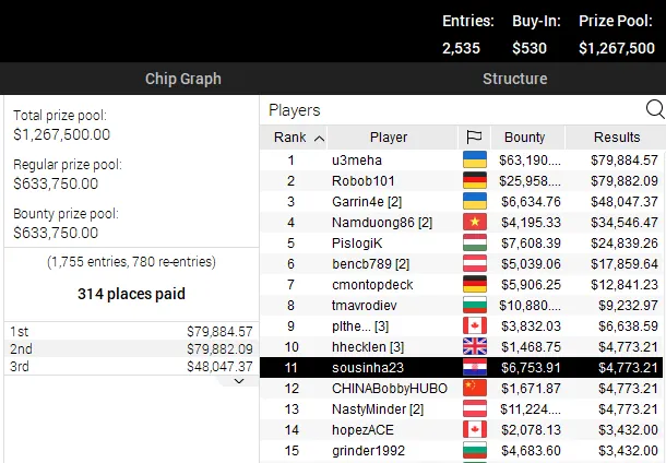 Já Rui "sousinha23" Sousa, registou uma deep run no High Roller Club: $530 Bounty Builder HR PKO, caindo muito perto da mesa final para receber $11.527 na 11ª posição.