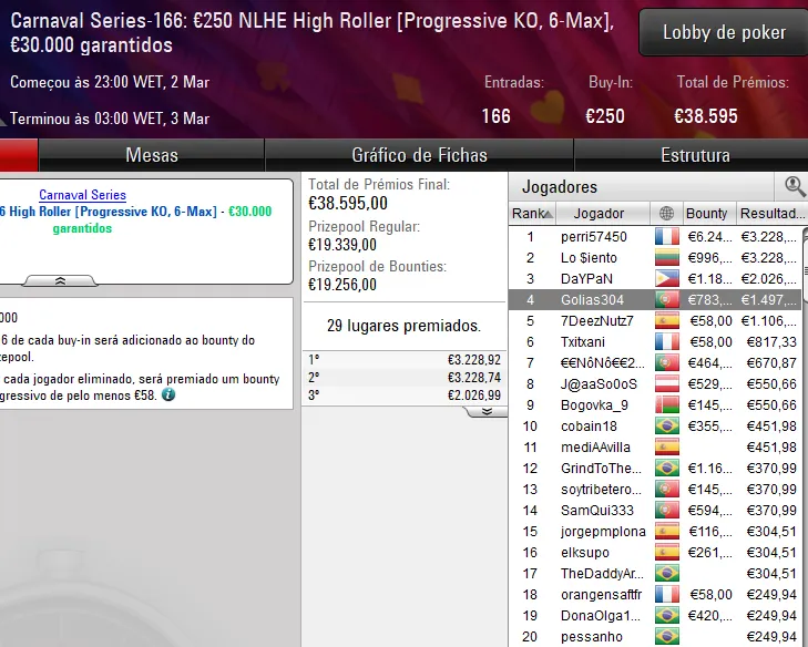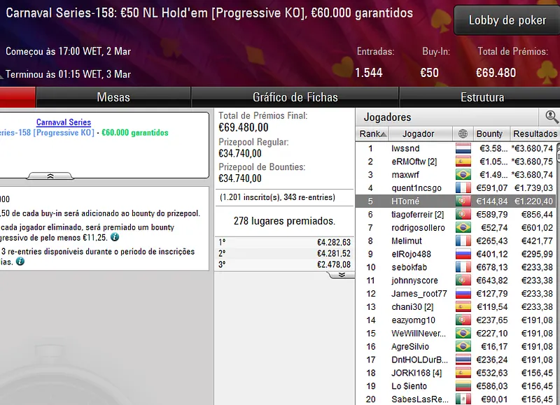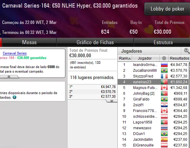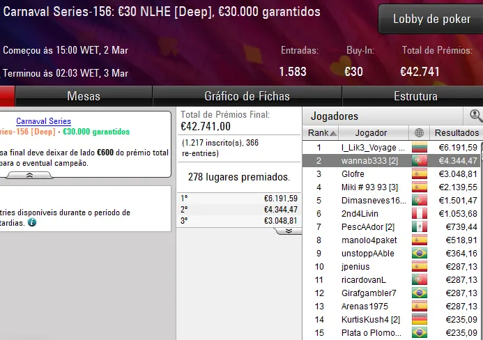 Já o dono da conta trabasum garantiu o segundo prémio de cinco dígitos do dia para Portugal. No Carnaval Series-152: €100 NLHE, o luso foi um dos quatro finalistas que chegaram a um acordo e levou para casa um prémio de €11.394 ao terminar no terceiro lugar do pódio.