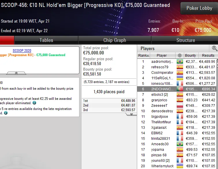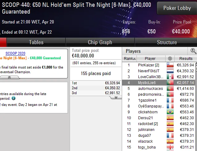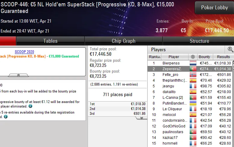 Quem também colocou a bandeira portuguesa no topo do pódio foi Pedro4620, campeão do SCOOP-462: €30 NLHE Sping Time Hyper. Este evento viu 1.063 jogadores (mais 244 reentradas) na luta por uma parte de €35.289 em prémios e foi o luso quem levou a maior fatia do bolo para casa, um prémio de €5.202.