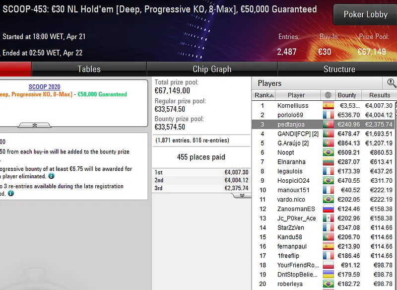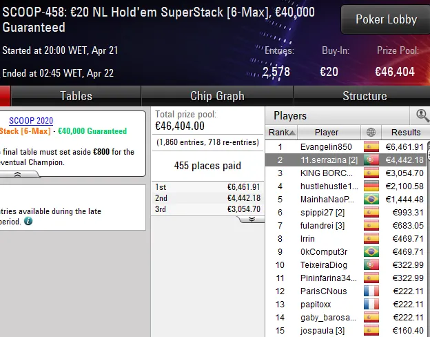 Já no SCOOP-450: €30 NLHE [8-Max], evento que contou com 993 entradas, insuficientes para cobrir o prize pool de €30K, o grinder português R_PokerSt@rs superou toda a concorrência e viu os seus esforços recompensados com um prémio de €4.658.