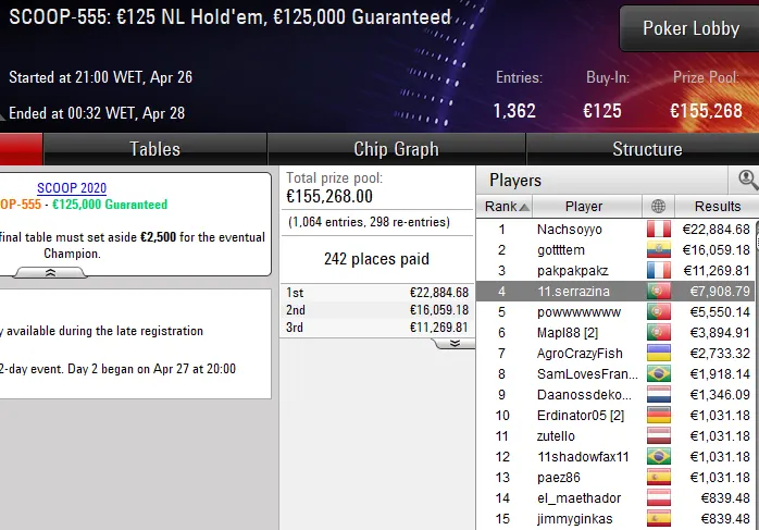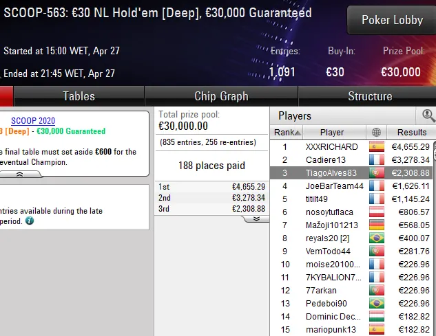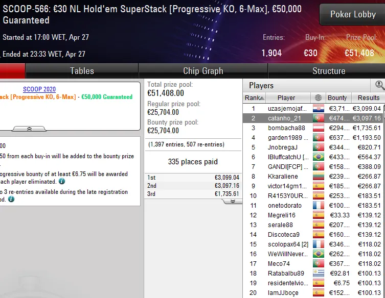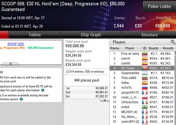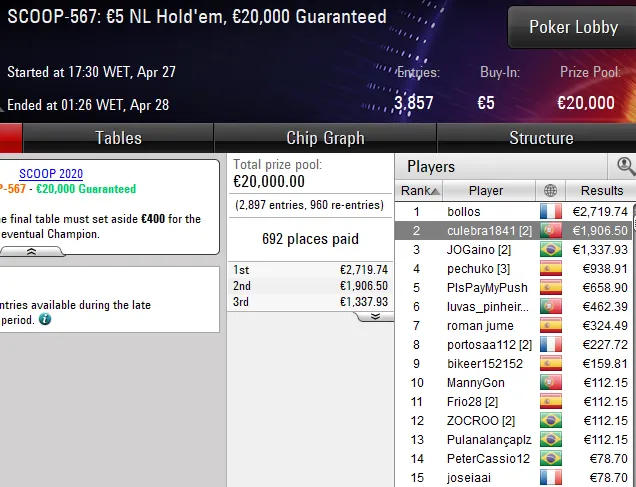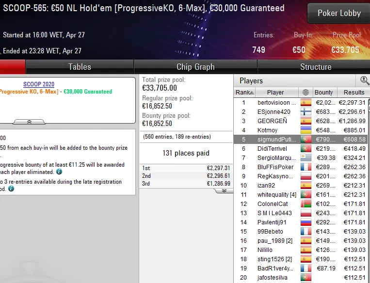 Pedro4620 foi outro dos campeões no grind de segunda-feira. O luso venceu o SCOOP-575: €20 NLHE [Turbo, PKO, 8-Max] para €5.183. O dono da conta luckyanna17 também brilhou e levou o título do SCOOP-577: €30 NLHE Spring Time Hyper com direito a €5.150.