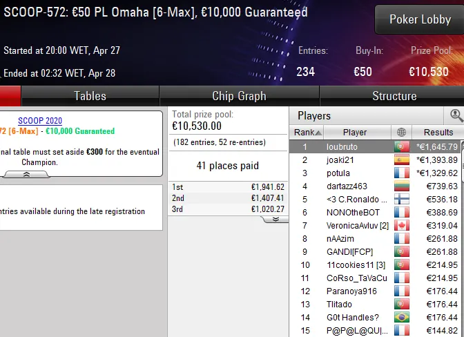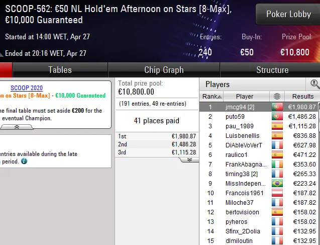 Já jmcg94 bateu toda a concorrência no SCOOP-562: €50 NLHE Afternoon on Stars e engordou a banca com €1.981. O título do evento diário de Pot Limit Omaha também veio para Portugal, com loubruto a vencer o SCOOP-572: €50 PLO [6-Max] para €1.645.
