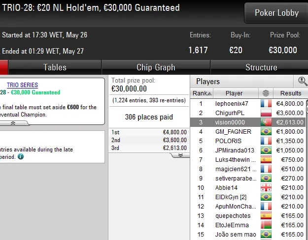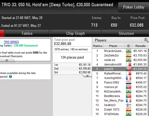 Na sessão desta terça-feira tivemos mais dois campeões portugueses no festival de torneios de poker online TRIO Series da PokerStars.pt.