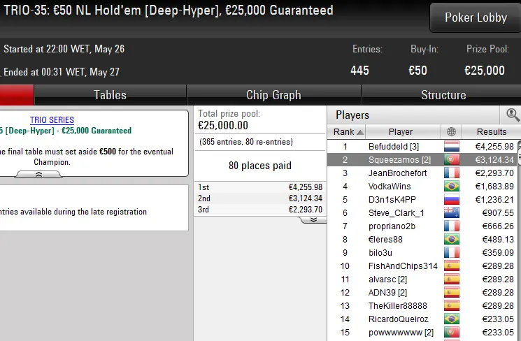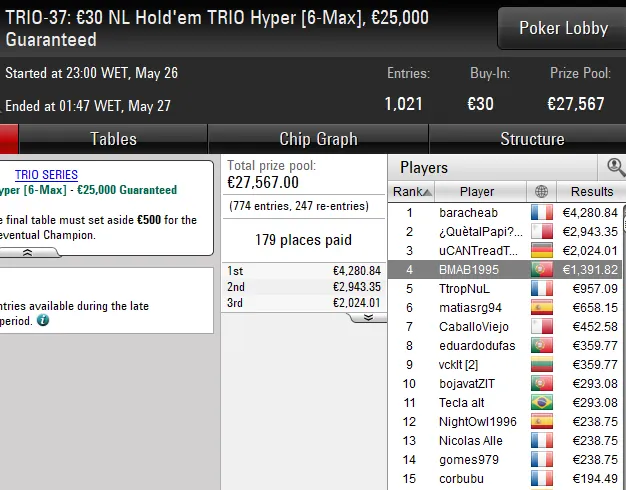 O outro campeão do dia foi o dono da conta dm pinheiro. O jogador português despachou todos os adversários que teve pela frente no TRIO-31: €10 NL Hold'em [Progressive KO, 8-Max] e transformou um buy-in de €10 num prémio de €3.698 em aproximadamente oito horas e meia de jogo.