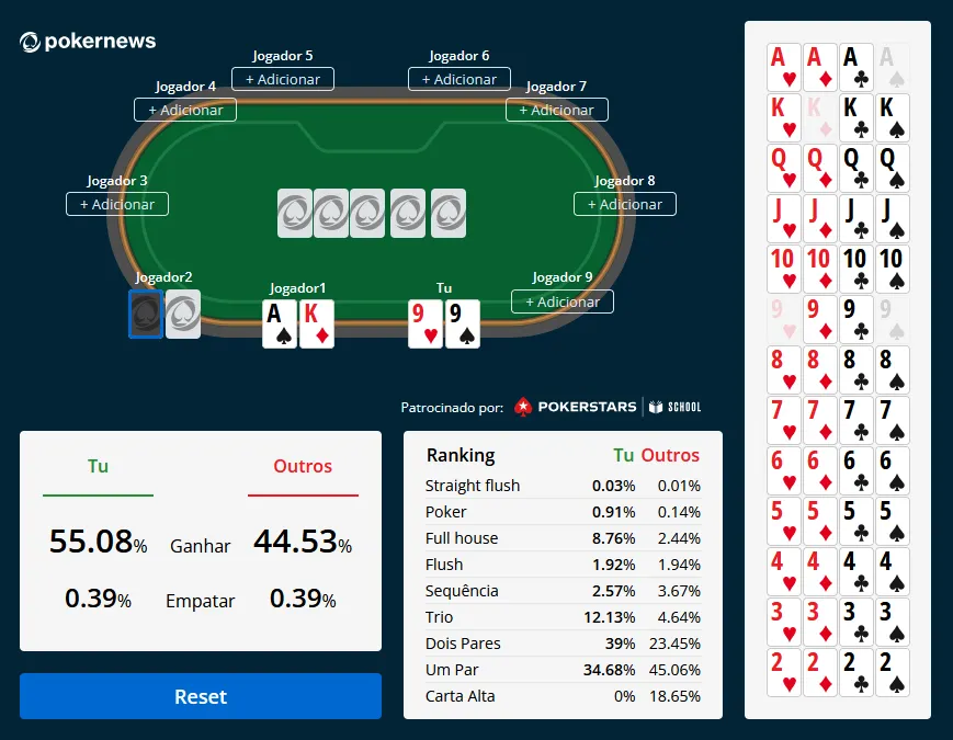 Para usar uma calculadora de equity, o primeiro passo é escolher qual delas queres utilizar — mais abaixo recomendamos algumas das melhores. Depois, podes introduzir as tuas cartas, os ranges dos adversários e, se quiseres, as cartas comunitárias.