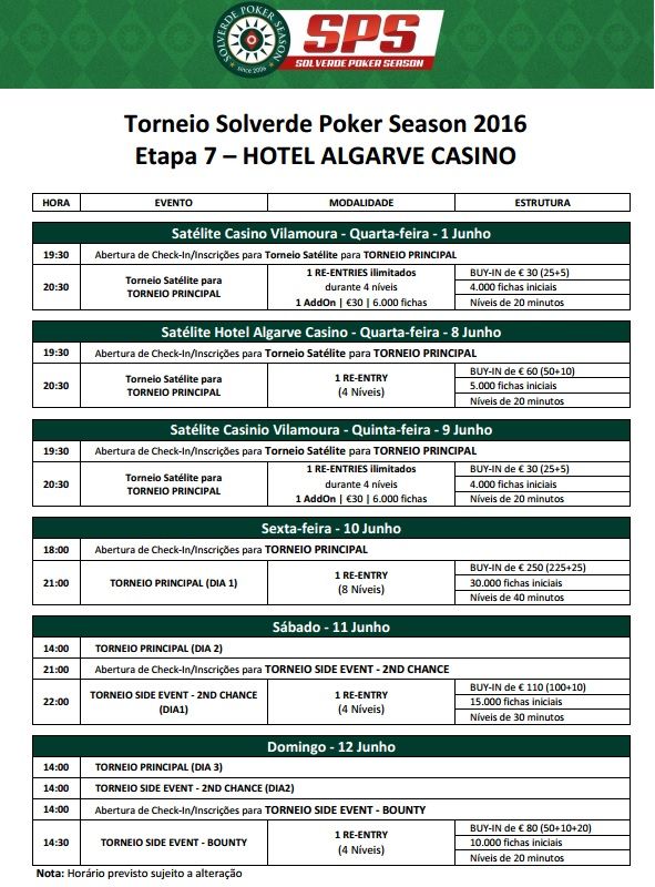 A próxima etapa do Solverde Poker Season será em Vilamoura com o torneio a realizar-se de 10 a 12 de Junho em Vilamoura. Esta etapa que conta com um Buy-in de 250€ para uma stack inicial de30.000 fichas e níveis de 40 minutos com a possibilidade de 1 re-entry.