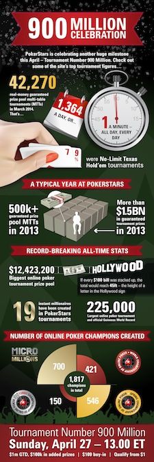 This coming Sunday PokerStars will reach another huge milestone with their 900 millionth tournament. To celebrate, PokerStars has created an infographic that reveals some key monthly and yearly tournament statistics and all-time record-breaking figures.