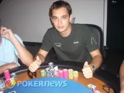 Dimi acabou de eliminar mais um concorrente com par de Dez contra , em um all-in depois do flop com . O turn deu a trinca para Dimi com o e o river foi outra . Dimi chegou a 32.000 fichas.