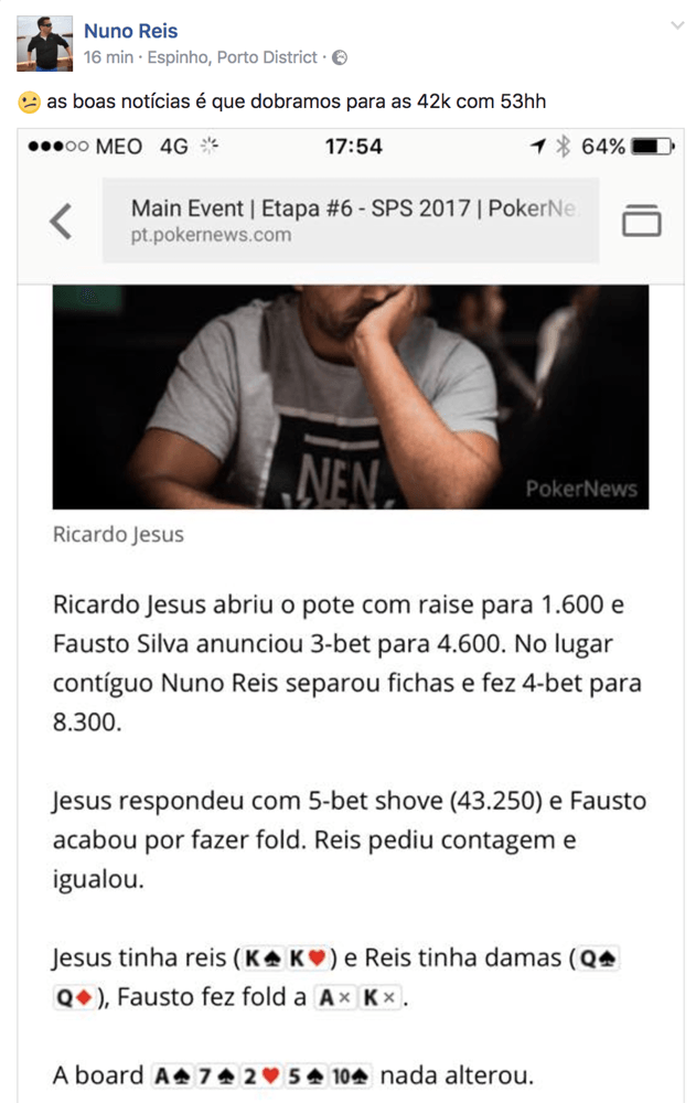 Jesus respondeu com 5-bet shove (43.250) e Fausto acabou por fazer fold. Reis pediu contagem e igualou.