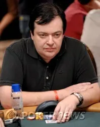 Com o bordo mostrando , Chris Ferguson apostou 11,800 e foi pago pelo jogador no cutoff. Ferguson mostrou para o full house e levou o pote, elevando seu stack para 28,500.