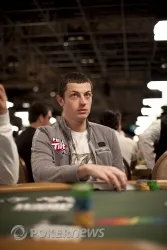 Dan Heimiller faz raise no cutoff e Justin Young 3bet no botão. Heimiller faz call e vão heads up ao um flop de . Heimiller faz check-raise a Young e este acompanha. Dan depois aposta num no turn e Young de novo faz call. Ambos os jogadores fazem check numa no river. Justin mostra para quarto par e foi suficiente para recolher o pot e ficar nas 9,200 fichas.